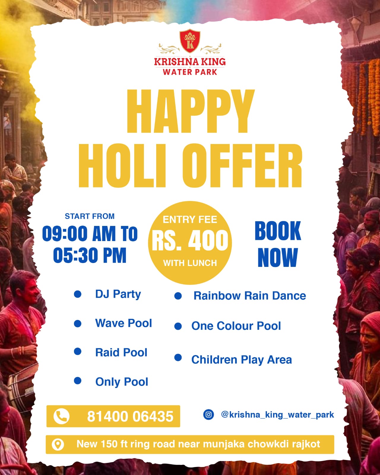 We are Krishna king water part and resort , we have many felicity in our watermark like water park , party plot , restaurant , resort. etc . our water park is more then 750 square meters area . and 3500 person capacity in our water park .