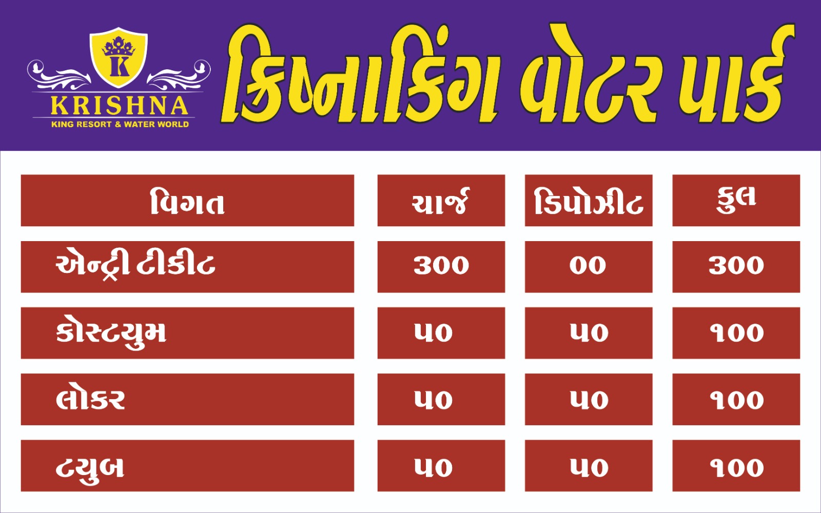 We are Krishna king water part and resort , we have many felicity in our watermark like water park , party plot , restaurant , resort. etc . our water park is more then 750 square meters area . and 3500 person capacity in our water park .